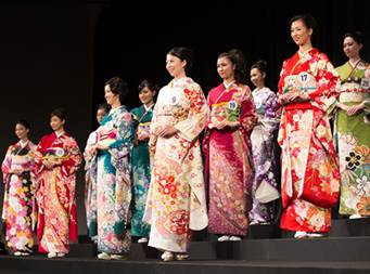 - 予選会を通過した候補者31名が着物姿で登場、一人一人が自己紹介とスピーチをし、淑やかに舞います。 この着物審査では、日本民族衣装である「ふりそで」を、日本代表としていかに華やかに美しく着こなせるかを審査します。